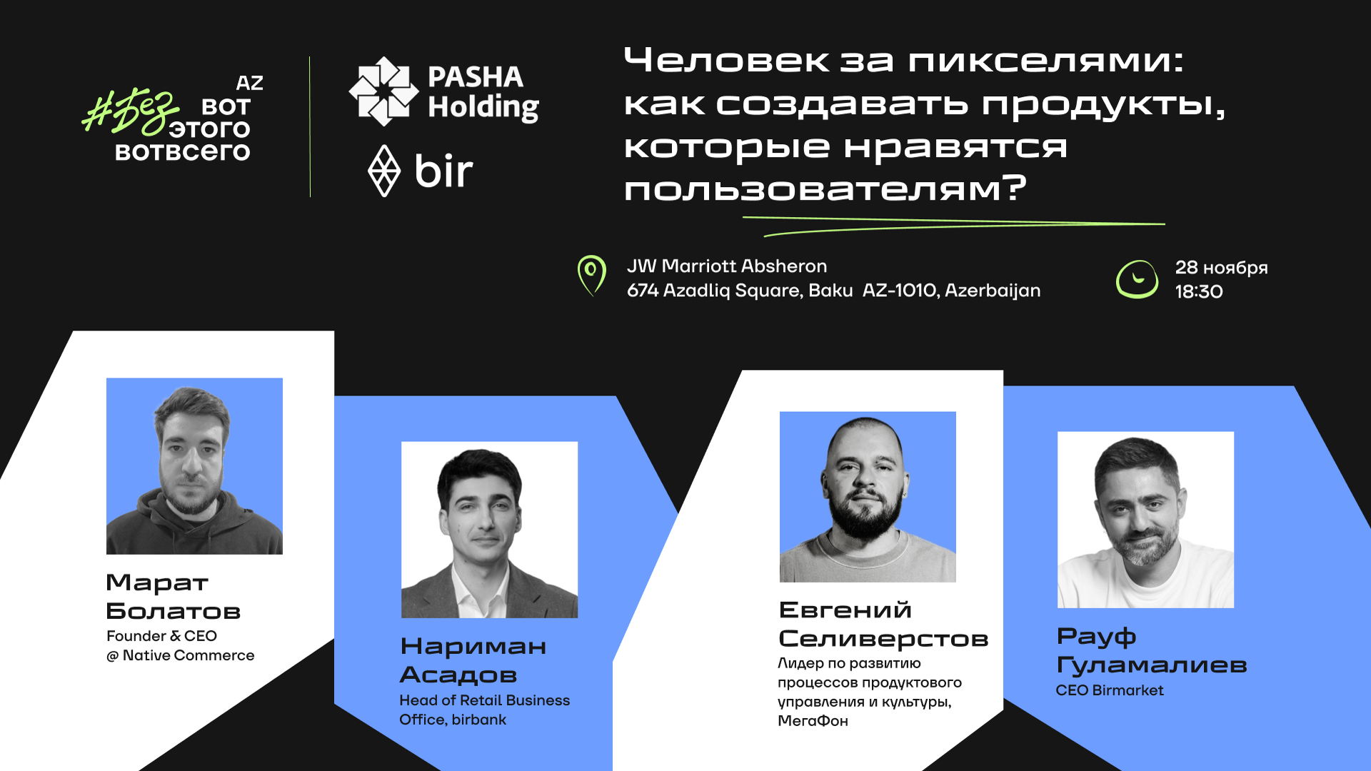 время летит стремительно, и вот уже в 7й раз мы собираем оффлайн встречу сообщества #безвотэтоговотвсего в Баку! На этот раз мы решили взять тему, которая трогает умы профессионалов в совершенно разных индустриях: “Человек за пикселями: как создавать продукты, которые нравятся пользователям?”.